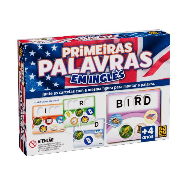 Descrição: O jogo Primeiras Palavras em Inglês possui uma combinação estratégica de 28 palavras com 4 letras cada. O jogo estimula o raciocínio da criança que, sem perceber, transita rapidamente da linguagem oral para a linguagem escrita. Ao sobrepor as cartelas que possuem uma mesma figura, o nome dela será misteriosamente revelado.